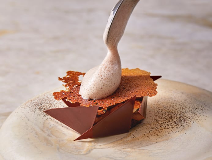 At Hakuba, Donckele has partnered with Japanese sushi master Takuya Watanabe and head pastry chef Maxime Frederic for an Omakase menu. Dishes may include marinated red mullet grilled over binchotan with koji, flawless tamago or the finest red tuna available.
