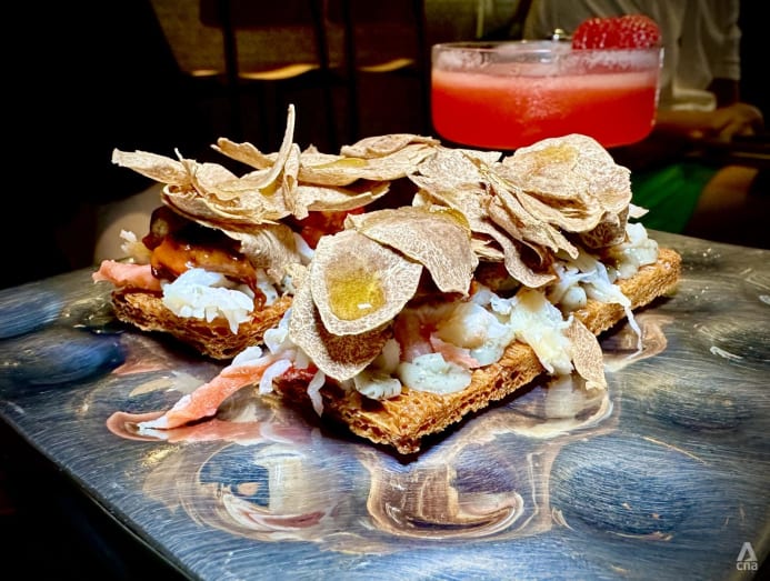 The menu opens with two snacks, each with 2g of white truffle per dish; then builds in flavour, intensity and, of course, truffle volume. There's the charcoal brioche, burrata and olive oil caviar (S$24); and the sea urchin and Alaskan King Crab toast (S$40).