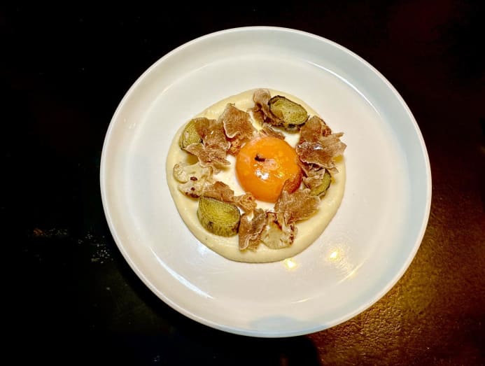 Then, two starters are on offer, each with 3g of white truffle. There's the confit Australian leek and organic cauliflower with poached egg yolk and hazelnuts (S$32), and the Japanese slow-cooked egg with potato foam, caramelised onion and croutons (S$32).