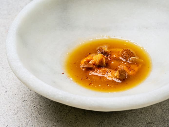 “We changed the traditional ingredient of egg yolk for sea urchin as it has similar textures and flavours but enhances the flavour. Then we have tiny peppers which come from an elderly lady farmer in the Basque country who harvests them by hand. They’re incredibly precious.”