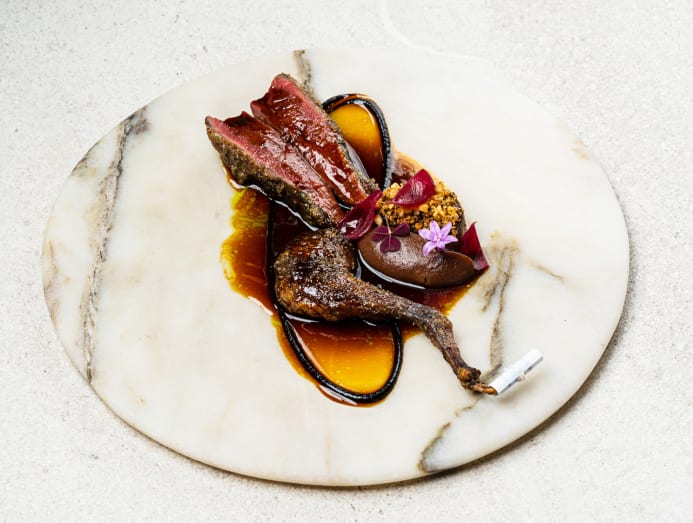 “Chele really wanted me to do our signature pigeon from Odette – but we did it with local figs, an oil made from the fig leaves and Filipino nuts. Then we had the pepper – the green brings freshness and pep, the pink brings round, fruity flavours and the black brings the peppery notes,” Royer said.