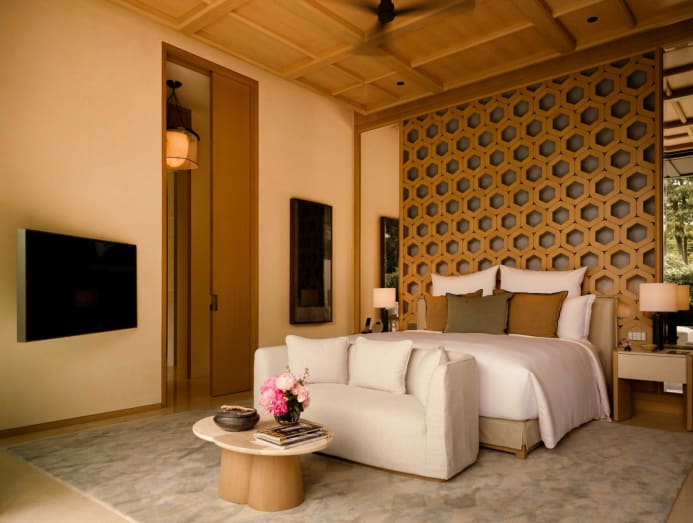 The opulent, 650 sq m four-bedroom Royal Villa boasts an expansive living room, a lavish master bedroom and bathroom, along with three additional bedrooms, making it ideal for larger groups or families. A tapestry in the living room with expressive floral patterns establishes a connection to the tropical surroundings.