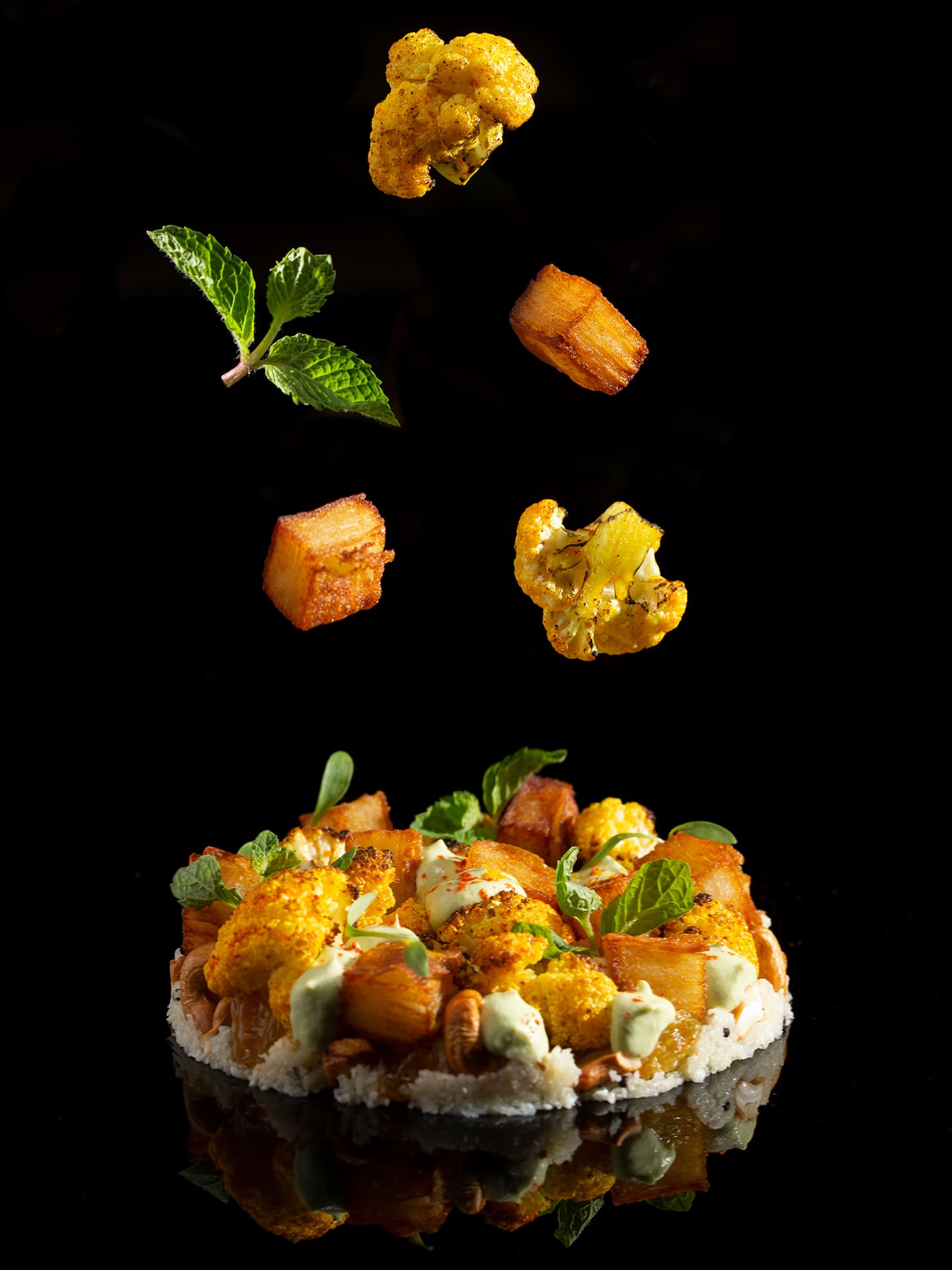 The result are runaway hits like This Is Not Aloo Gobi, where cauliflower is cooked three ways as couscous, puree and roasted florets and paired with crispy layered potatoes, cashews, raisins and masala compote as well as Prata Waffle???, a waffle pressed prata topped with Madras-style fried chicken and a side of butter chicken sauce.