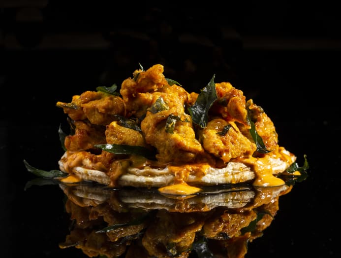 The former is quite unmistakably a deconstructed version of the ubiquitous Indian dry curry of cauliflower and potatoes while the latter is his unique spin on the classic American fried chicken and waffles. In fact, foodies might recognise the spice blend of the Madras-style fried chicken to be similar to chicken 65, a comfort dish that southern Indians often order at their local joint.