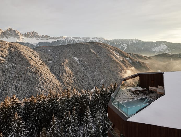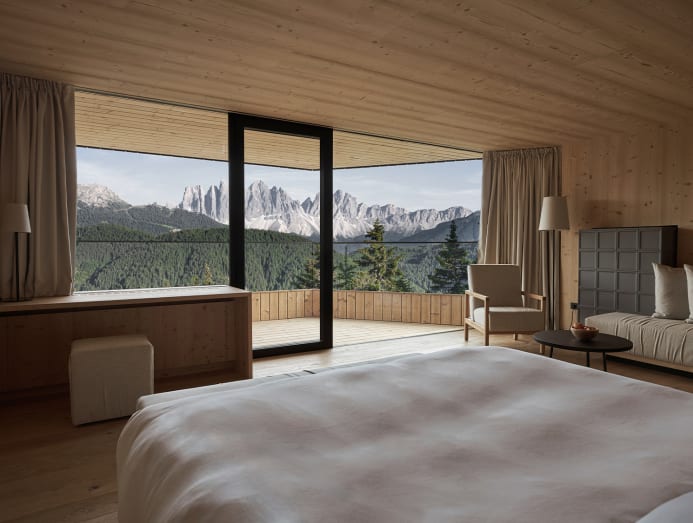 Forestis was launched in 2022 with the addition of three tree-like towers to the original building – all linked by a glass tunnel. Two towers are topped by double-storey Penthouse Suites, each with an outdoor swimming pool and spruce wood sauna. Groups of up to 10 can exclusively book the new five-bedroom villa, a renovated alpine-Art Nouveau building with a stone cellar, loggias, and a top-floor home cinema and lounge under original rafters dating back to 1911.