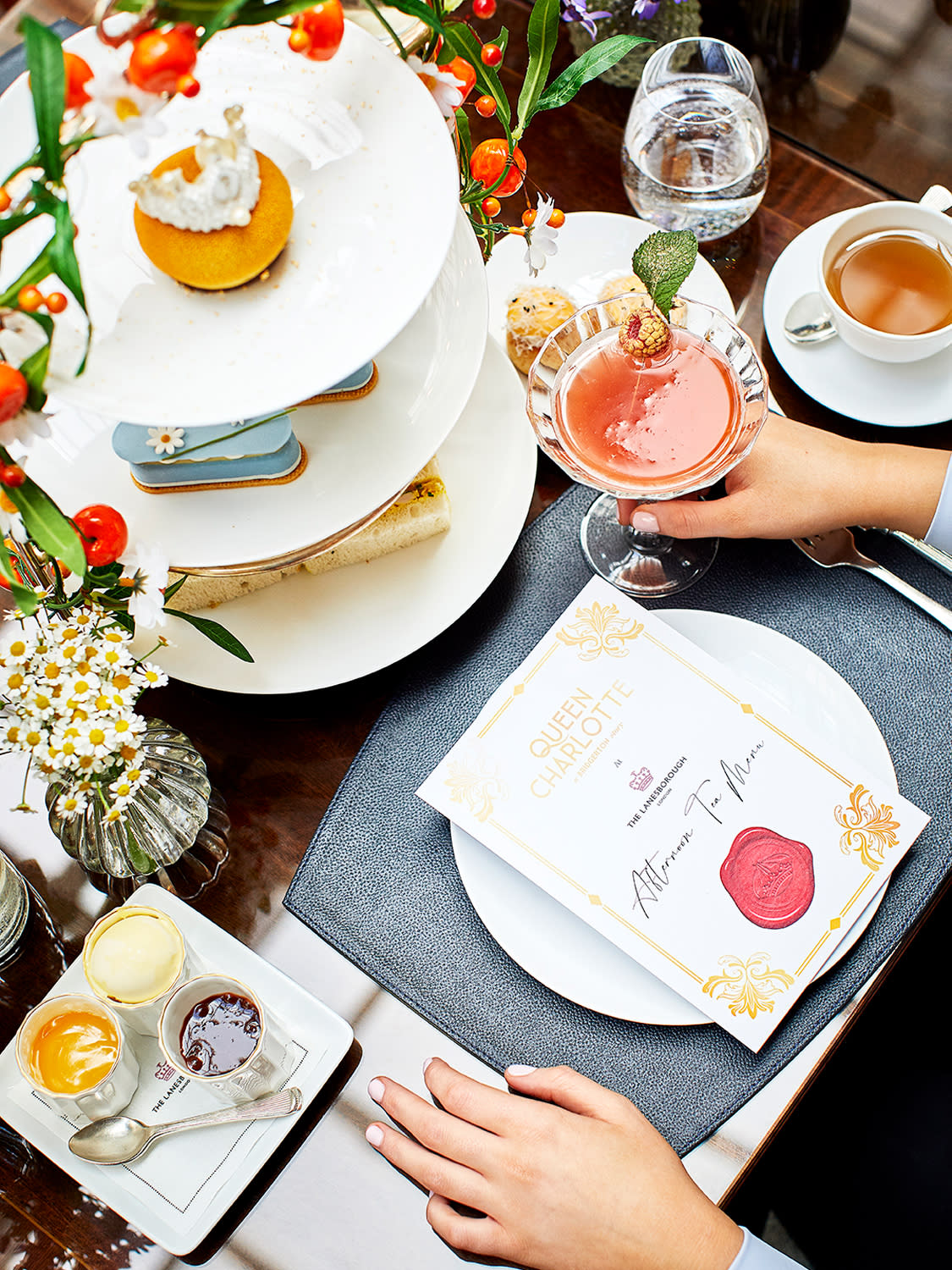 What is really fun though, is how head pastry chef Salvatore Mungiovino has created a selection of pastries inspired by the show’s characters like a strawberry scented creme bavaroise with infused orange gel shaped like a crown in honour of Queen Charlotte. All you need to do to be part of this pretty scene is to stick your pinky finger out as you sip your tea.