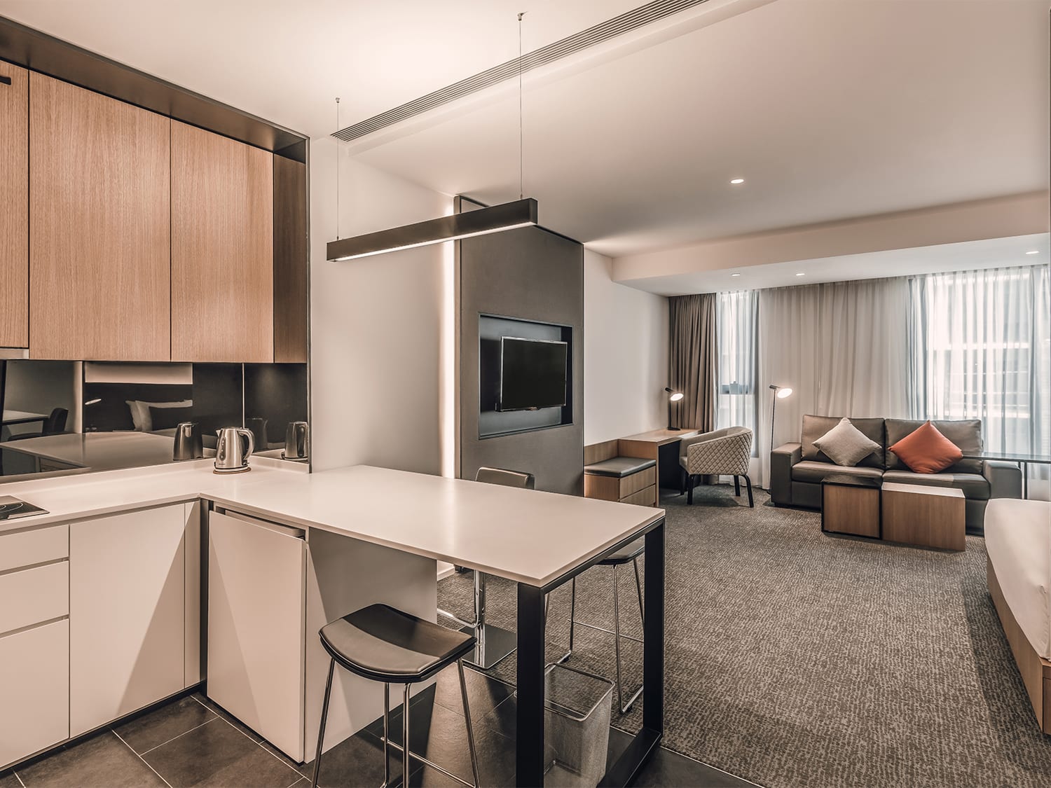 Somerset Serviced Residences properties have dual-key and interconnecting room options while Citadines Raffles Place Singapore has a shared working space at the lobby fitted with varying seating arrangements such as communal tables and barstools at high tables. The latter also has moveable tables that can be discreetly parked beneath a work desk or used as an extension for dining purposes. Guests can also prepare meals or host a private meeting in the Resident’s Kitchen, a private dining space that doubles up for both meetings and intimate dining events.