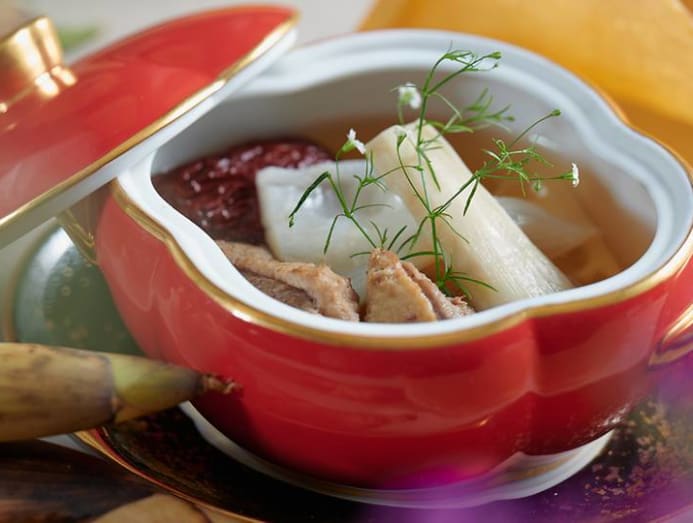 "The colour of Jinhua ham is much lighter than Iberico ham and the fat is more concentrated. Jinhua hams are mainly cooked, as the aroma and umami are fully evoked after heating. The longer the simmering time, the smoother the aroma and taste will be. Therefore we picked Jinhua ham to make the broth of the dish Double-boiled Snow Goose, Fish Maw, Spring Bamboo Shoot in our new spring menu."