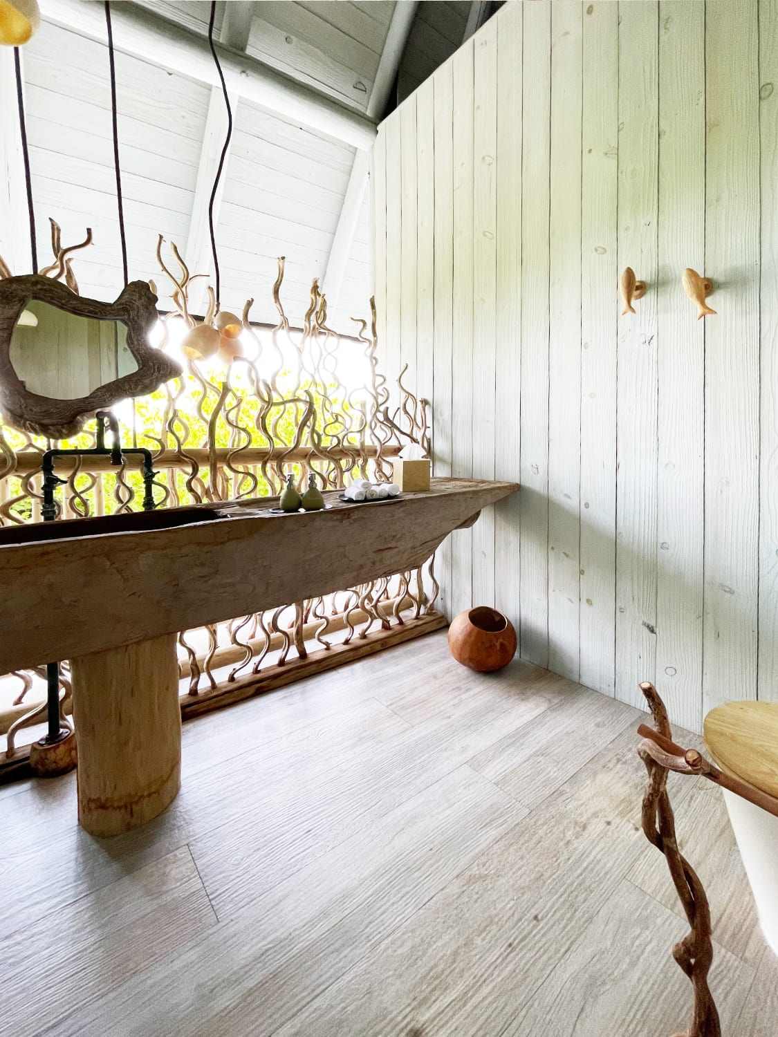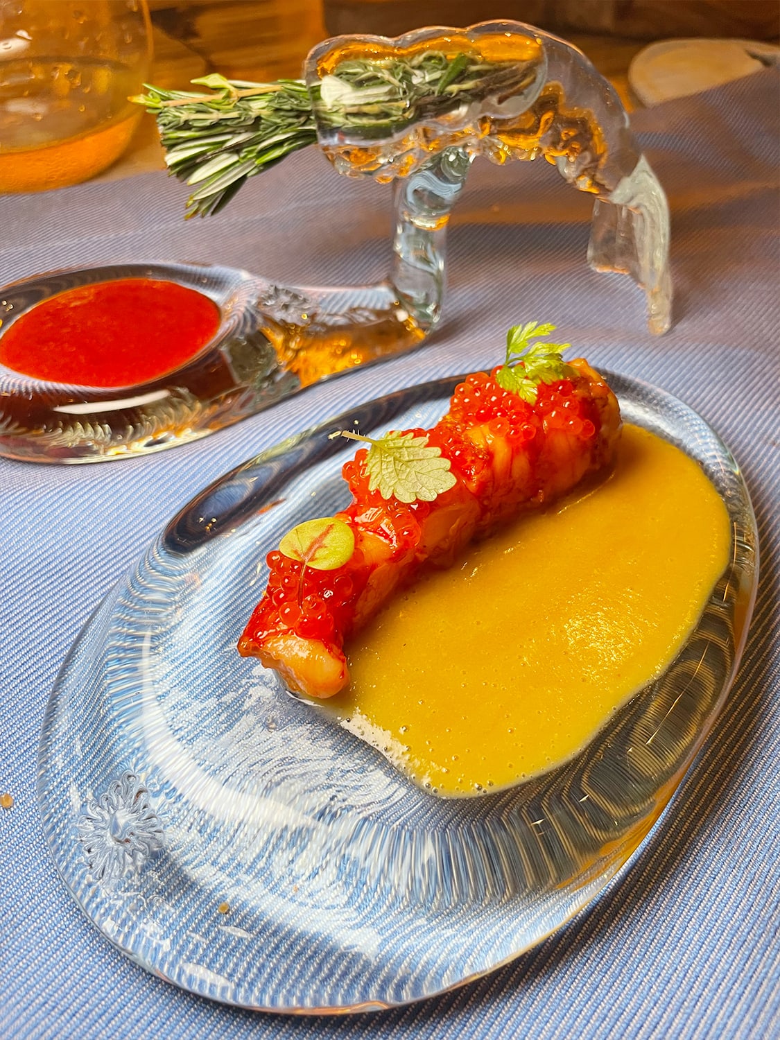 Dining decisions were tough. Do I zipline or walk over to the Out of This World dining tower, which has a wine cellar and observatory? I went for “yolo” and zipped over in a dress. Brazilian chef Henrique Lork’s tasting menu breezed across umami, spicy, salty and acidic profiles with the food presented on elegant upcycled glassware that were made by the chef himself. The wine pairings were excellent: Sommelier Rebecca delivered a storied selection, including a 100% Pinot Gris orange wine from New Zealand and a terroir-driven 100% Chardonnay from South Africa. From the tower’s third-storey perch, I could see the setting sun’s golden rays streaking through cumulonimbus clouds. In the distance, a trio of manta rays appeared in the crystal-clear waters near the beach. It was surreal.