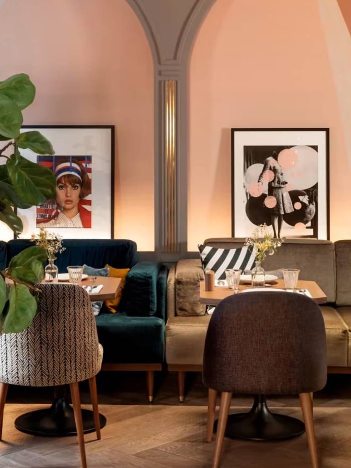 Donat says the decorative shutters on the facade of the building are never closed, but “they are there because it’s a message we sent to your subconscious to say it’s a real house”. In keeping with the “comme à la maison” philosophy, a homely vibe pervades the communal areas on the ground floor. There are small tables for work or coffee, with upholstered chairs on one side and a wall of green and grey velvet sofas on the other, under alcoves painted soft pink.