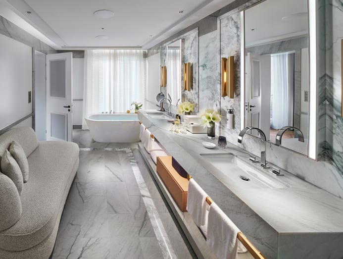 Located right across from the original headquarters of UBS and Credit Suisse, the hotel is only a stone's throw away from the luxury flagship stores lining Bahnhofstrasse and an easy stroll to Lake Zurich. Housed in a building dating back to 1838 that was home to the iconic Baur en Ville hotel — the first grand hotel in Zurich — it was wise for French designer Tristan Auer to retain some of its storied flavour.