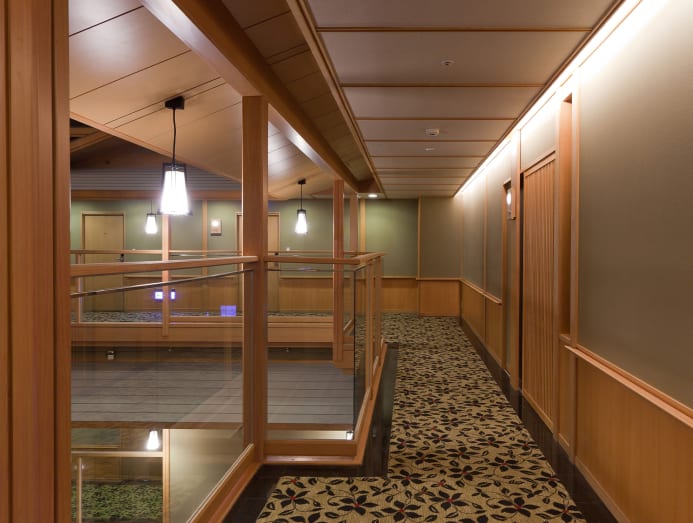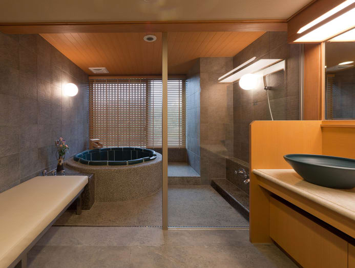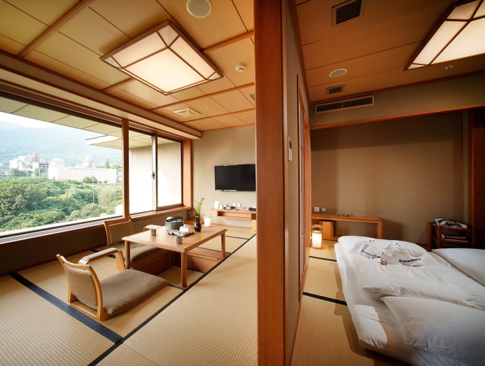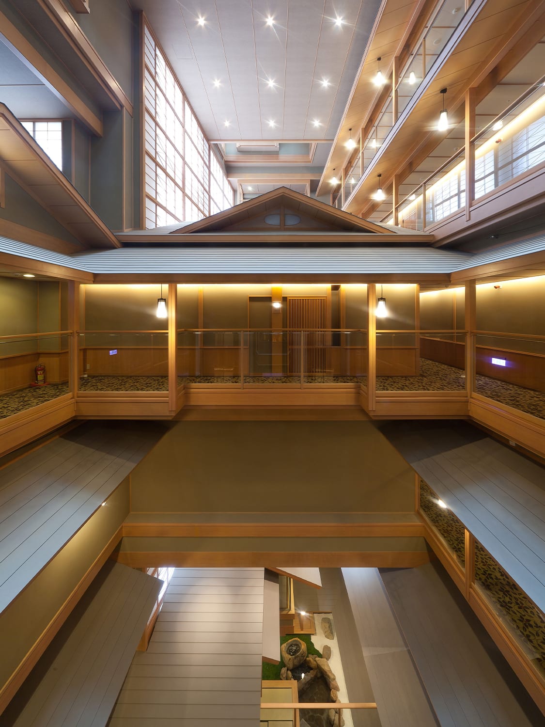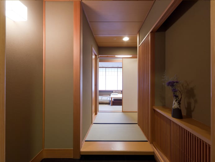 The hotel building is decidedly modern, capped with peaked roofs. But inside, the interior architecture inspired by the sukiya style developed during the Azuchi-Momoyama (1574-1600) and Tokugawa (1603-1867) periods has all the Zen feels of a traditional ryokan.