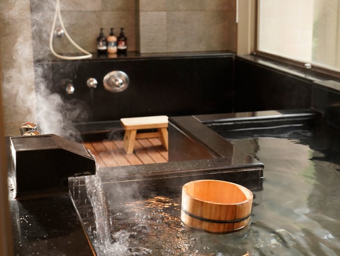 Radium Kagaya offers an array of options to experience the hot springs. On the fourth floor is a white sulphur public bath that is separated into men and women. Here, contouring pools and large windows to tree canopy makes it hard to leave. There are also 17 rooms for private soaks. Each is named after a month in the traditional Japanese calendar, with interior designs based on themes like ceramic, cypress and natural stone.