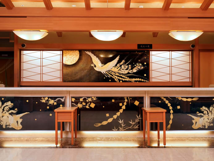 Many of these crafts have been integrated into the interior design. For example, at the reception, a gold inlay of a phoenix rising toward a shimmering sun greets guests. On the elevator foyer at the second storey, Asakura Isokichi’s Kutani murals depict flowers from the four seasons.