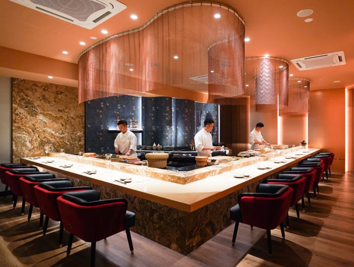 The elegantly appointed restaurant features a 12-seater sushi bar where diners can watch the chefs in action against a serene backdrop of a water feature and Japanese cranes. A small lounge is also available for diners to have a pre or post-prandial tipple from the curated list of sakes.