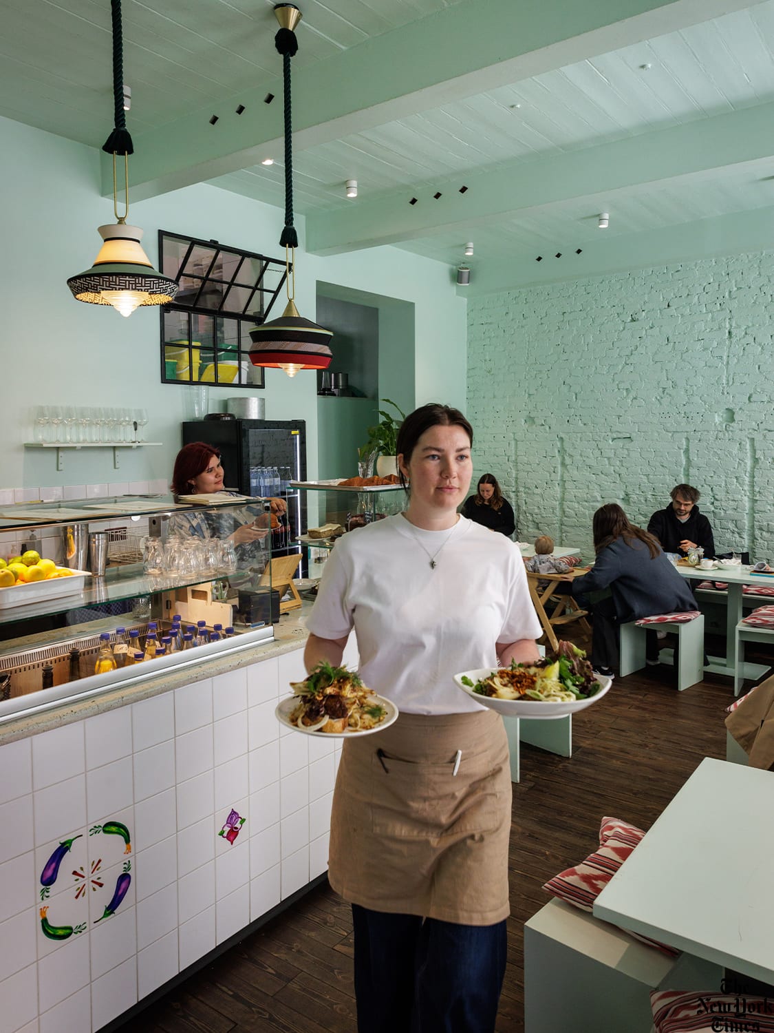 The sisters Xenia and Sophie von Oswald mix and match Persian, German and Australian influences at rocket + basil, an easygoing, no-reservations eatery near the busy Potsdamer Platz, with exposed brick walls painted mint green inside. This is the place to load up on fibre, with a weekend menu that includes an omelette filled with butternut squash and leeks, then topped with a kale and sesame salad, or a thick sourdough toast piled high with cannellini beans, roasted radicchio and hazelnuts, with dill sprinkled on top. For a sweet option, try the mascarpone pancakes, served with caramelized bananas, maple syrup, pistachio butter and barberries. If you have space left, grab a baked good at the counter; the moist pistachio-rosewater cake and the tahini-halva brownie are equally delightful (brunch for two, 40 euros).