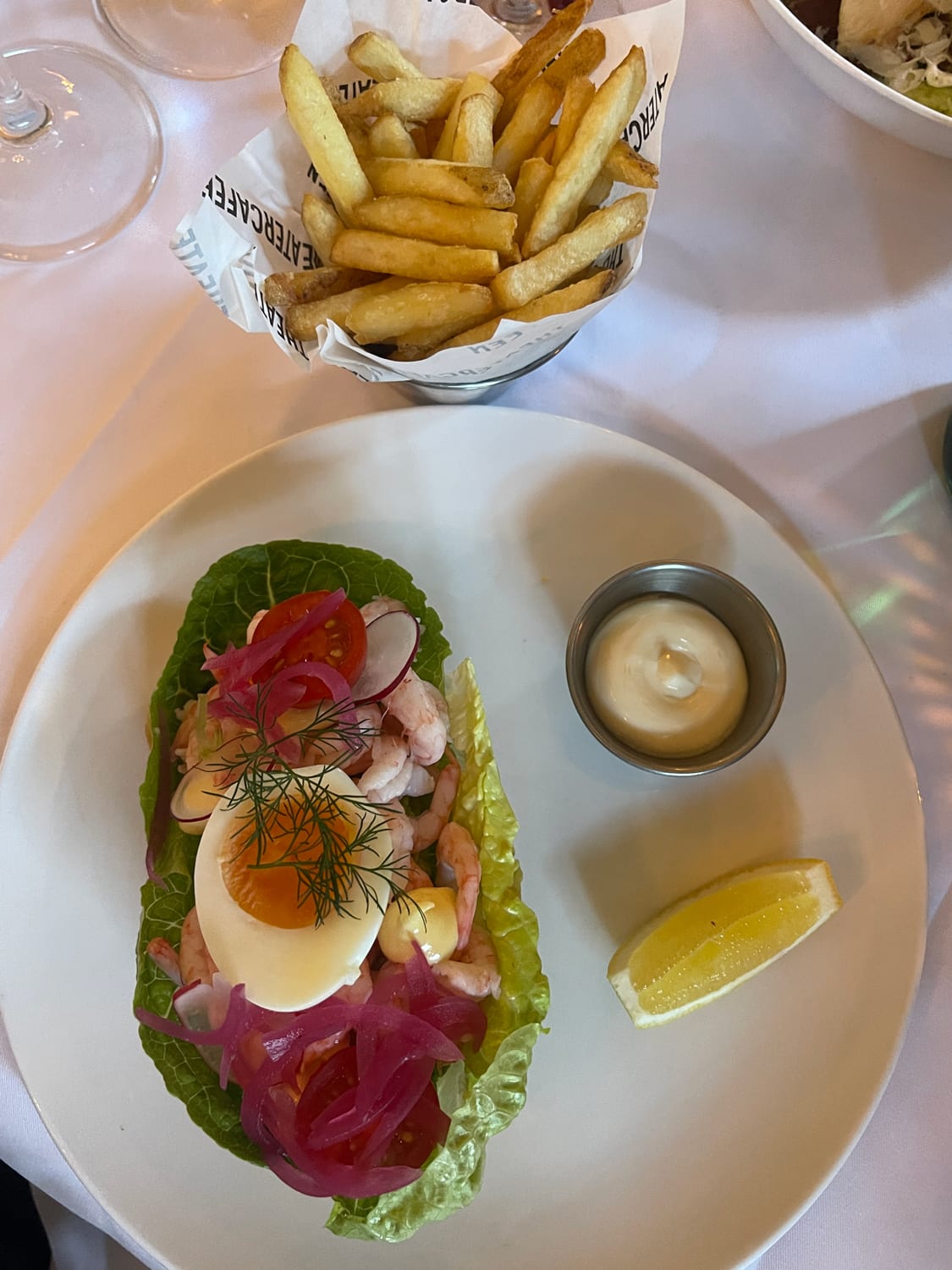Lunch featured a bona fide Norwegian classic in the form of an open sandwich, decked with sweet pink shrimp from Lyngen, egg mayonnaise and dill, served with perfect fries and a crisp glass of Sancerre. Dinner raises the bar with plates including vendace roe – some call it Norwegian caviar – with red onion, sour cream and lemon, or turbot with cucumber, mushrooms and orzo, once again emphasising the stunning quality of the nation’s seafood.