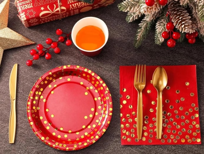 This red-and-gold set of disposable tableware features nine different items, including large and small plates, paper cups, cutlery and napkins. There are 24 pieces of each item and a red tablecloth to top it off. Plates are made of high-quality paper, ensuring that liquids won’t soak through the bottom easily.