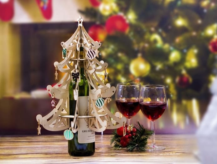 Transform your wine bottle into a conversation starter with this wooden puzzle that doubles as a festive decoration. When fully assembled, the plywood tree even lights up. Turn it into a fun craft activity for the kids with some paint and craft decorations.