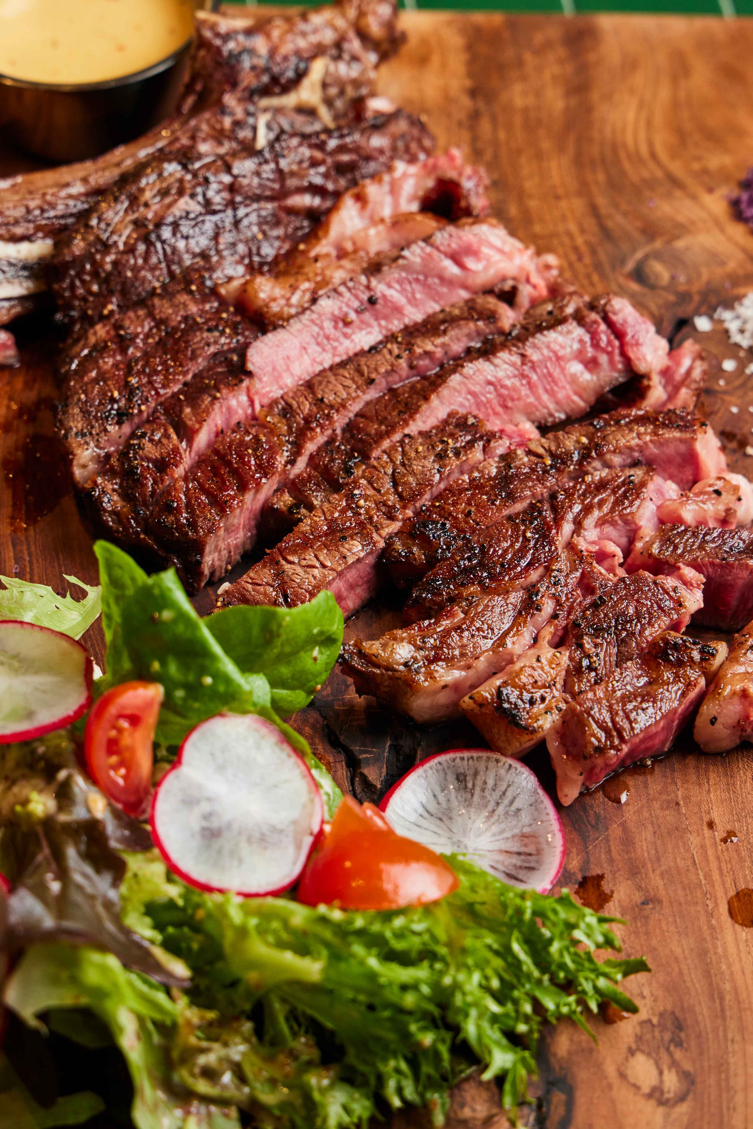 Beautifully tender Australian free-range, grain-fed beef with gorgeous smoke-tinged char. Comes with fresh greens, bearnaise sauce and flavoured salts, including a pepperberry (a Tasmanian pepper) option with a bright, slightly fruity aroma.