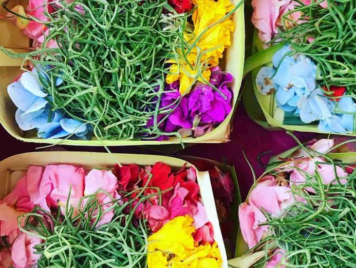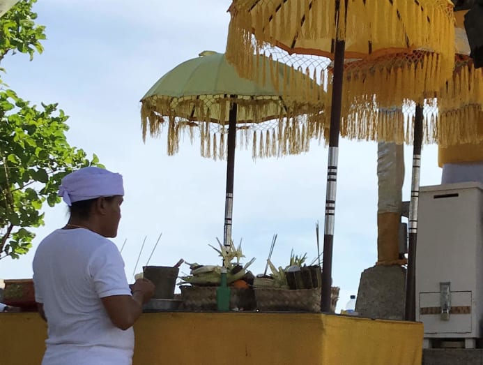 Here, in the inner shrine, closed off from the madding crowd that mills outside, the mangku blesses the water and preps the elaborate straw baskets of canang sari, or offerings comprising fronds and rice, and multi-coloured flower petals which represent the cardinal points of the compass.