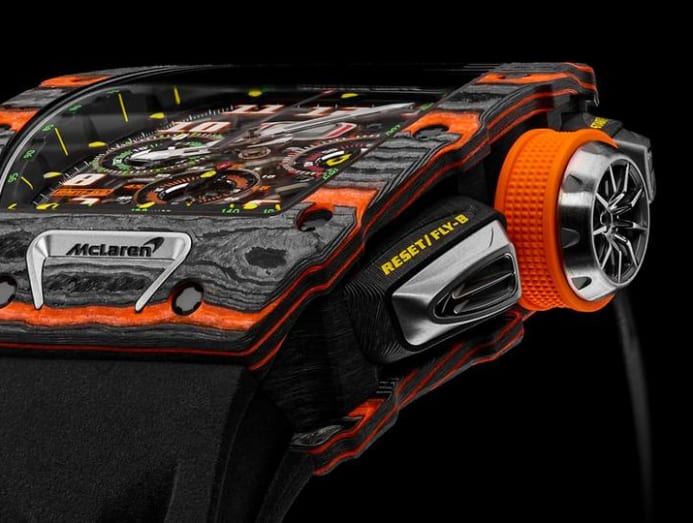 The latest venture in the Richard Mille-McLaren-Honda alliance: The RM 11-03 McLaren Automatic Flyback Chronograph, a timepiece that allows wearers to quickly restart the stopwatch function to time the next lap.