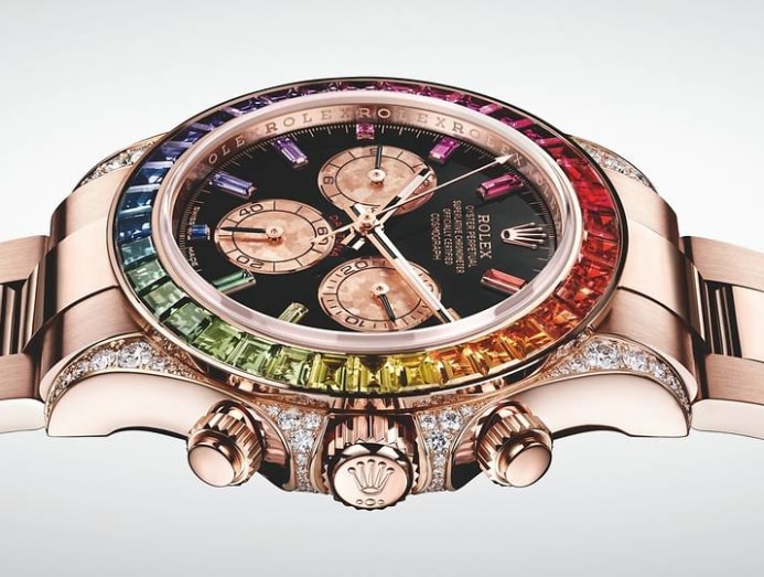 This year, Rolex revived the Rainbow Daytona in Everose – the brand’s proprietary formula for rose gold. Produced in extremely limited quantities, the distinctive watch, with its 36 baguette-cut sapphires arranged in a rainbow spectrum around the bezel, was initially available only in yellow or white gold.