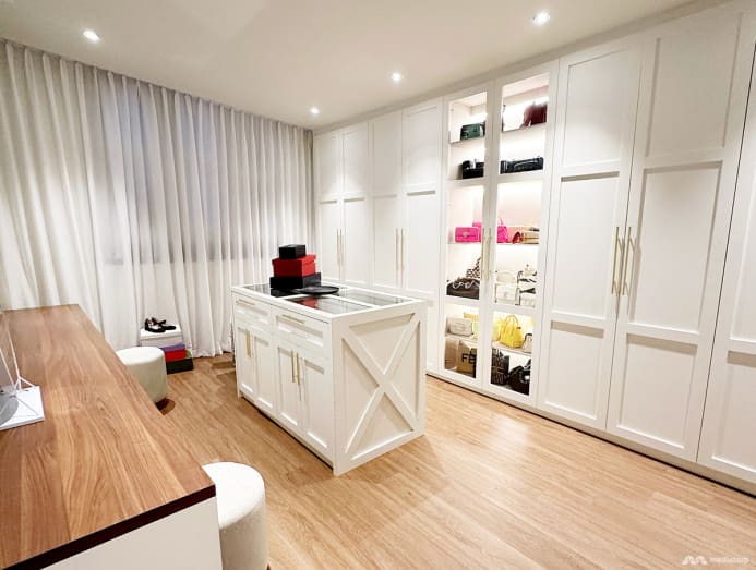 The space exudes boutique vibes with designer purses on display and an island for jewellery and trinkets. Closets lining both lengths of the room provide ample storage, though if you asked Chantalle, she wouldn’t be able to tell you the contents of each of them.
