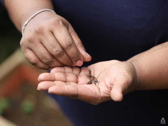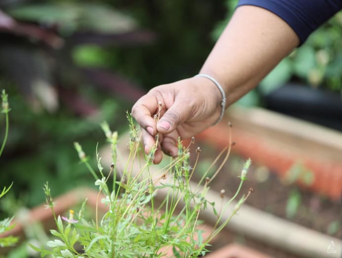 Pointing to a leafy plant growing close to the ground, she explained: “This is the wild pepper plant, which I got from a friend from Pasir Ris Park Kitchen Garden. Wild pepper plants are grown on the roadside all over Singapore. It’s used to cover the ground because we have clay soil; it protects the layer of soil from impacting the plants. It also helps in the treatment of respiratory disorders like coughs and colds.”