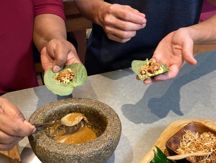 “Use wild pepper leaves as a base, and put a whole load of condiments in, such as chilli, lime, lemongrass, ginger, green mango, some shallots, peanuts, toasted coconut. Add in a sauce made from tamarind juice, gula melaka, salt. Then wrap it up into little parcels to eat,” she said, demonstrating how to do it.