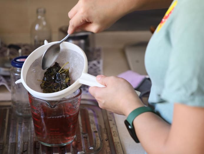 So, she started creating her own flavoured syrup using her home-grown shiso leaves, firing up a claypot, caramelising sugar in it, adding hot water, and finally, a generous handful of thoroughly-rinsed leaves, and letting the mixture simmer gently for several minutes. Once done, she lets it cool down, strains the liquid, and decants it into a clean jar, ready for use.
