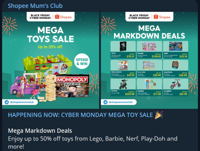 @ShopeeMumsClub on Telegram was privy to no more than 4,000 members when we infiltrated. True enough, input codes shaving up to 10 per cent off Nerf guns and Play-Doh sets were released in the recent Cyber Monday sale.