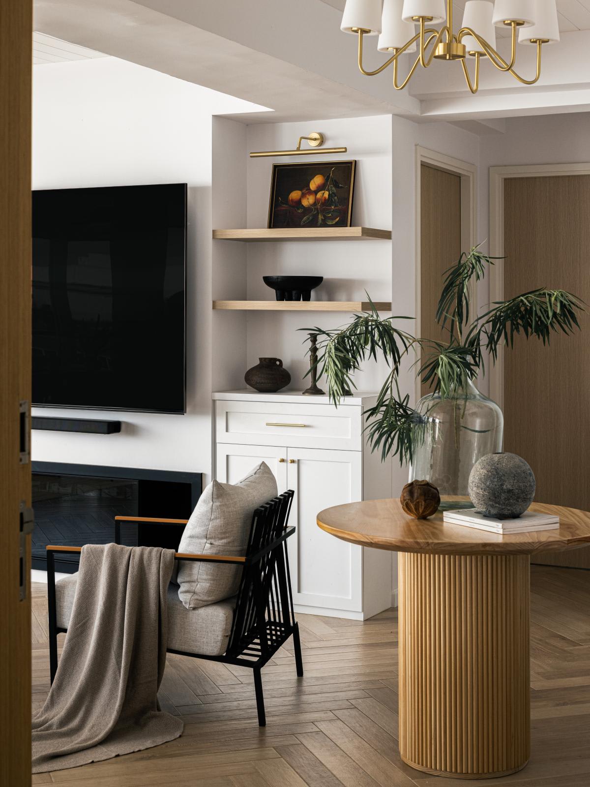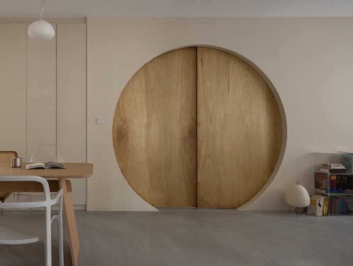 Yet, despite the extensive carpentry, the dumbbell layout unit doesn’t feel visually heavy. That’s thanks to a consistent use of a single laminate finish, which unifies the space and keeps it feeling light and airy.