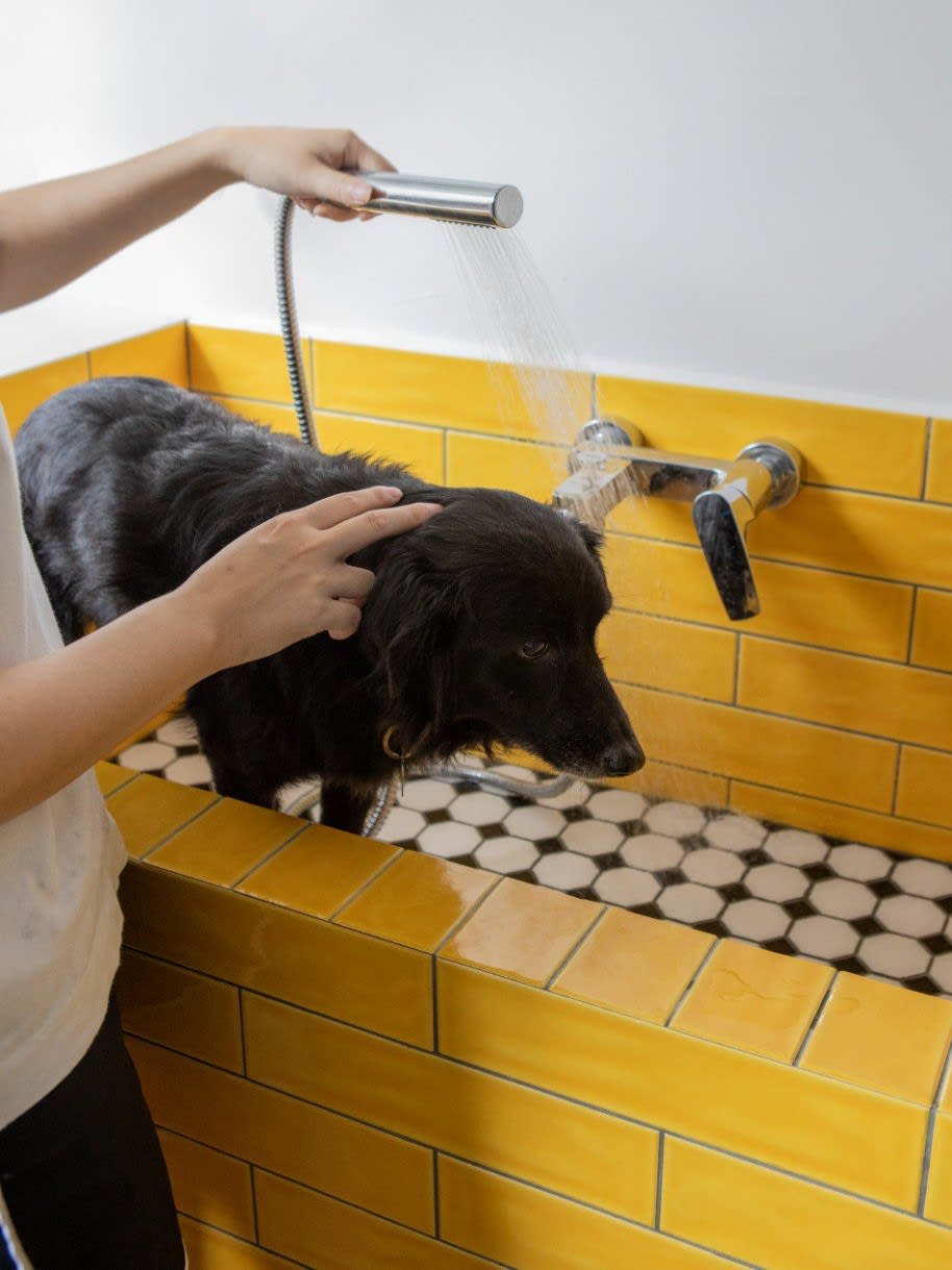 To keep bath time safe, especially for senior dogs, non-slip flooring and proper drainage are non-negotiables. A handheld showerhead offers more control with squirmy dogs, and chrome fixtures make an easy-to-clean choice that can take a few scratches in stride.