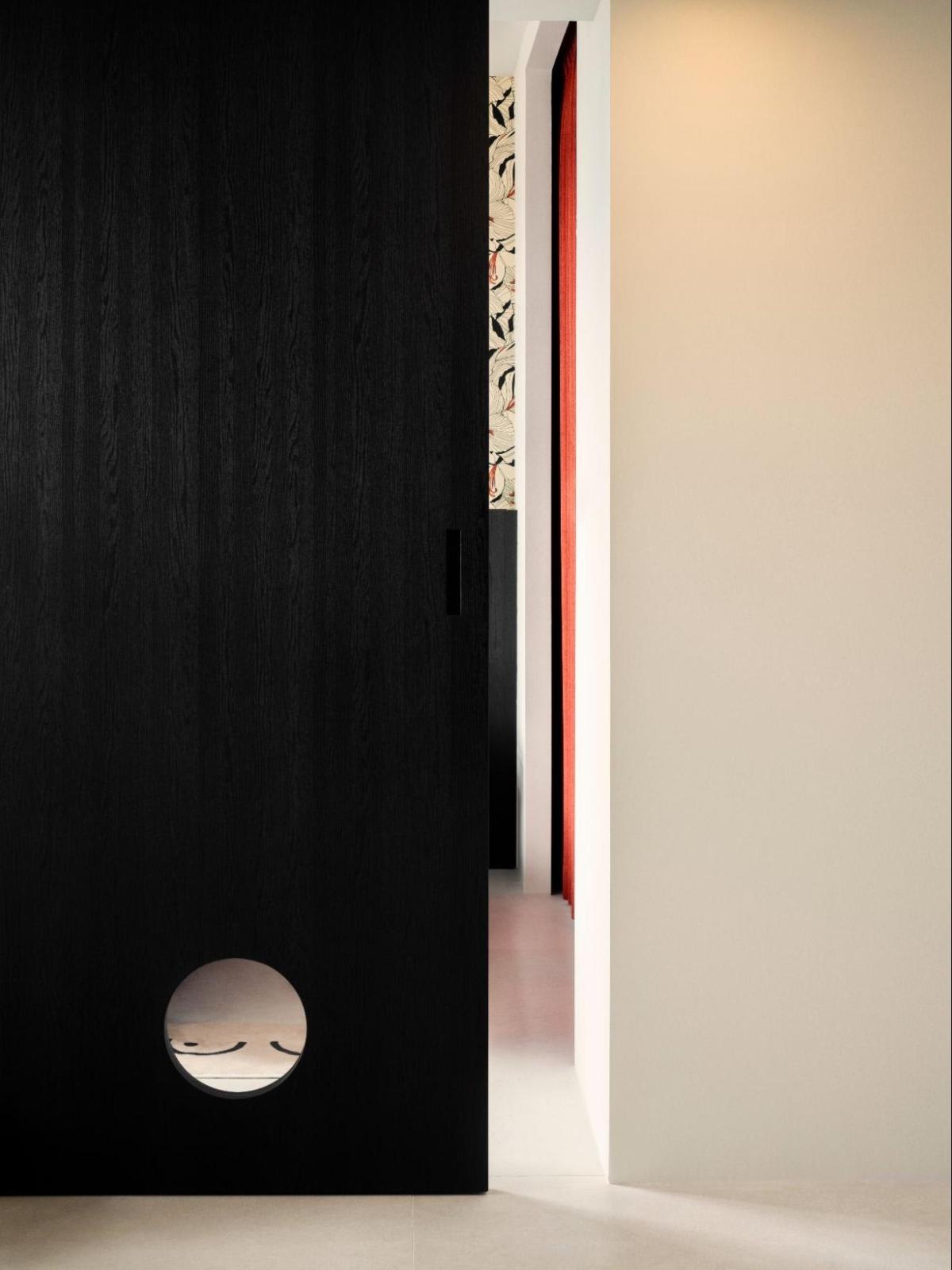 Of course, keeping a pet behind closed doors doesn’t mean they have to miss out on the action. Knowing how nosey dogs can be, the couple added a whimsical detail: Peepholes along the corridor walls.