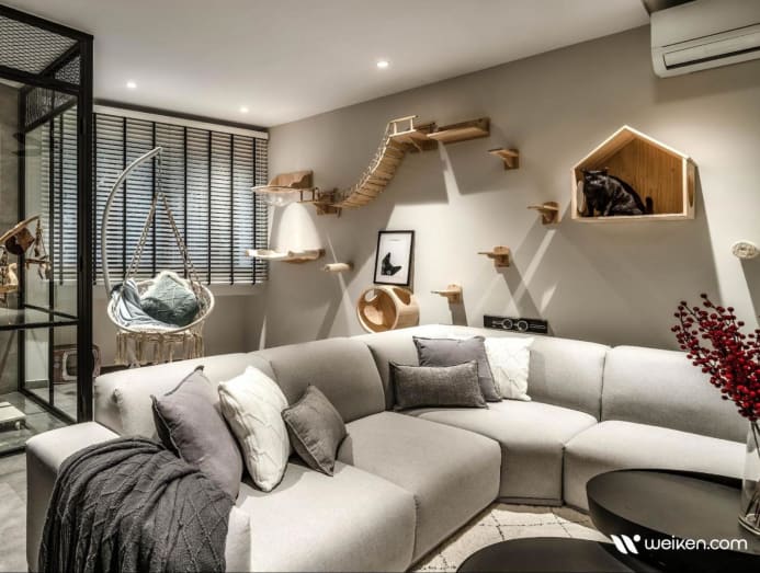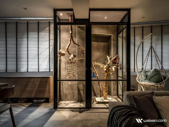 Not a dog person? No problem. Pet-friendly spaces work for all kinds of companions whether they’re furry or feathered. Take this four-room resale HDB flat in Woodlands, in which interior designer Lucas Ngan created a bird enclosure for two parrots and a wall-mounted playground for two cats.