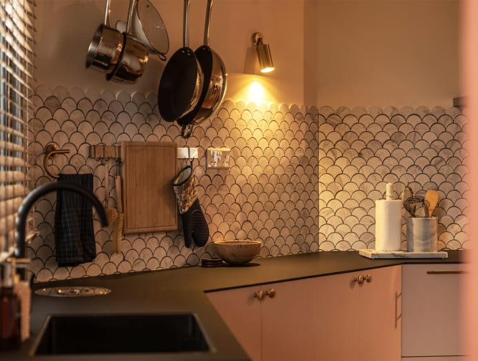 Opposite, a row of full-height cabinetry in the same pink tone offers plenty of hidden storage, while also housing the oven and the fridge. Keeping the kitchen accessories to a strict colour palette of stainless steel and black helps keep the space looking sleek and luxe.