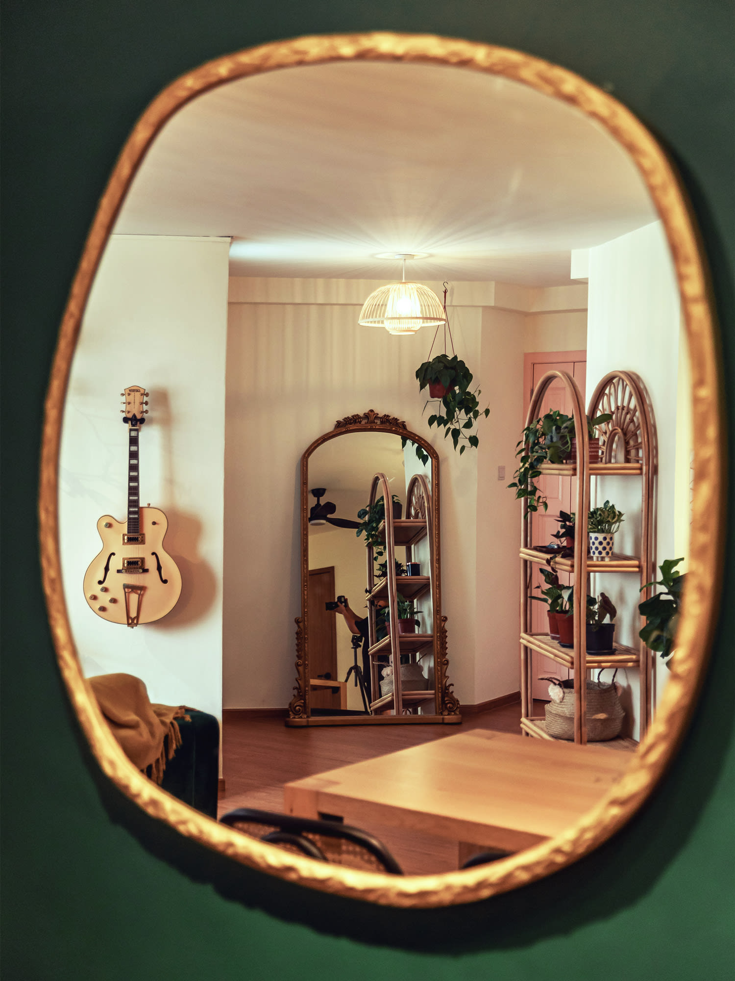 Pops of pink and gold were incorporated to complement their beloved green sofa. For example, the front door is painted in an eye-catching shade of salmon pink. It opens onto the entryway, with a tall rattan shelf laden with leafy potted plants creating a mini indoor tropical “jungle”. A large, wood-framed floor mirror leaning against the opposite wall makes the space appear larger and brighter.