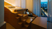 The design of the spacious master suite is influenced by the famous green sofa – the built-in wardrobe at its far end is done up in the same shade.