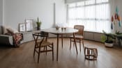 The flooring in the living and dining areas, kitchen and bedrooms was redone in vinyl resembling long wooden floorboards, in a warm teak hue. Walls were kept mostly white. Overhead, black ceiling fans and white track lights with orange-hued bulbs were installed throughout. Wooden blinds in the same colour as the flooring, were used as window treatments.