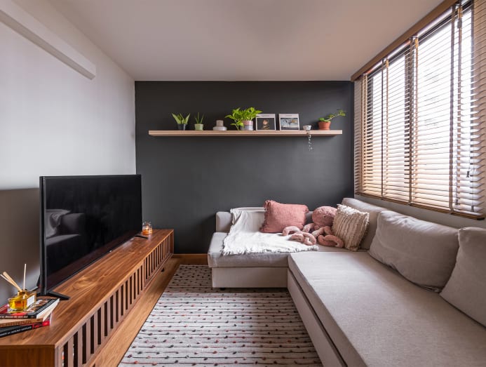 With the added space created, the couple also managed to create a serene chillout space, furnished simply with a long, low teak console, a dark grey feature wall with one wooden shelf that holds pictures and ceramic vases, and a beige L-shaped sofa strewn with cushions and throws.