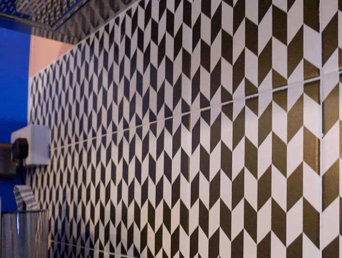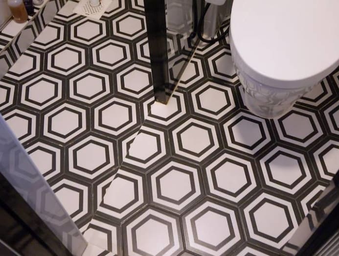 Black-and-white hexagon-patterned tiles in the bathroom. (Photo: The Moving Visuals Co)