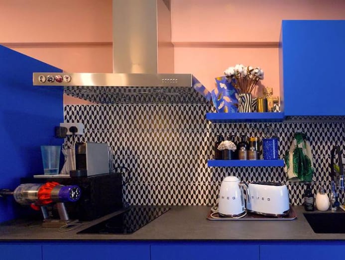 As such, a single row of kitchen cabinets in electric blue laminate pops against the salmon pink and grey subway-tiled walls. Black-and-white patterned tiles on the backsplash provide even more of a playful contrast.