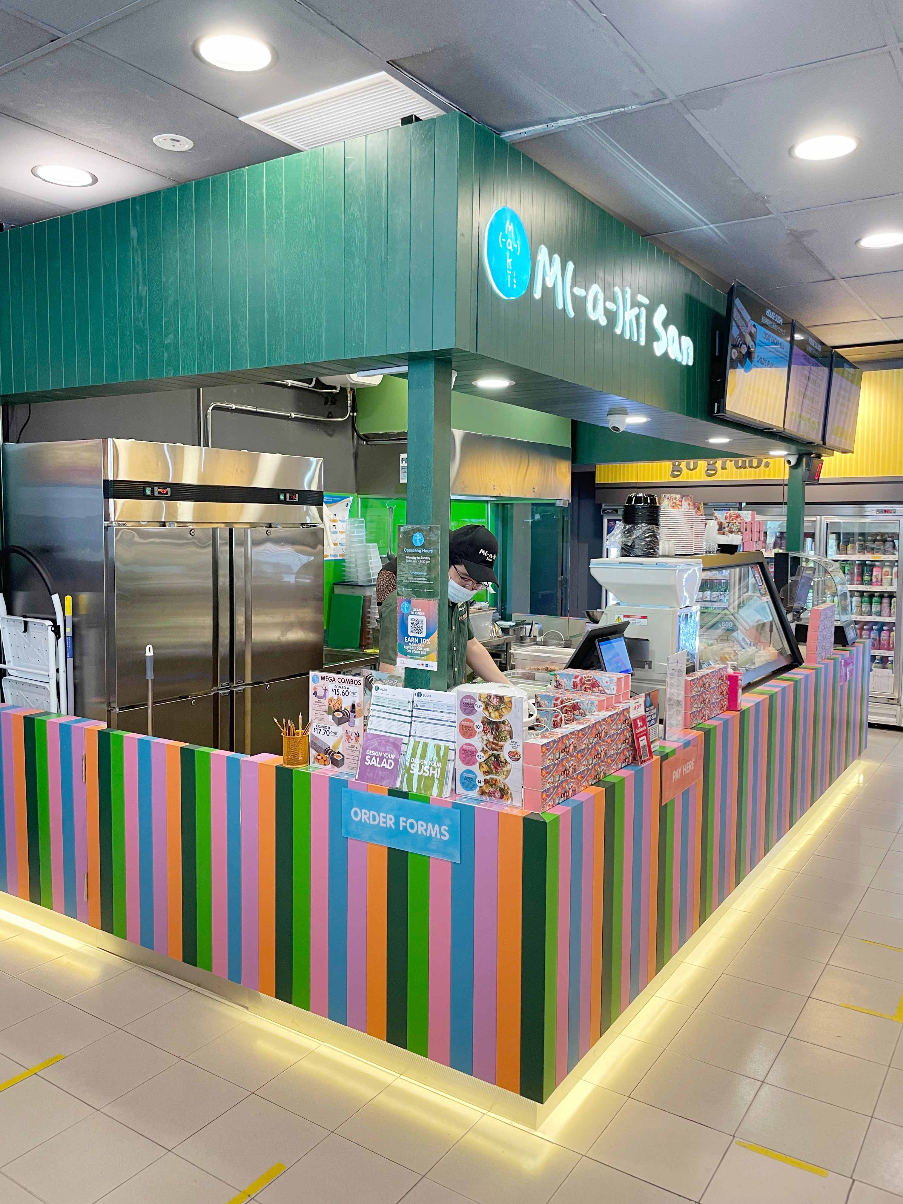 Sandwiches, cakes, curry puffs — all common snacks typically found in the mini mart of a petrol station. But freshly made-to-order sushi at a dedicated counter? We’ve never seen that before. Local fusion sushi roll joint Maki-San opened its first takeaway kiosk on March 4 within a FairPrice Xpress at Esso Toa Payoh. Two Maki-San staff are stationed here to craft customisable rolls with your choice of 70 types of fillings, mostly cooked items like ebi tempura, crab stick, and only one raw option of salmon sashimi.