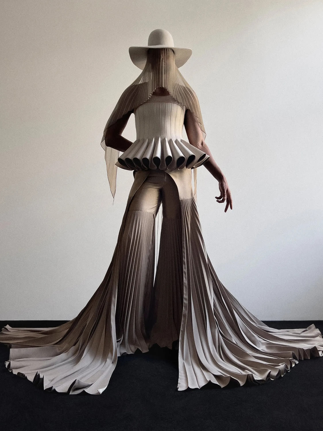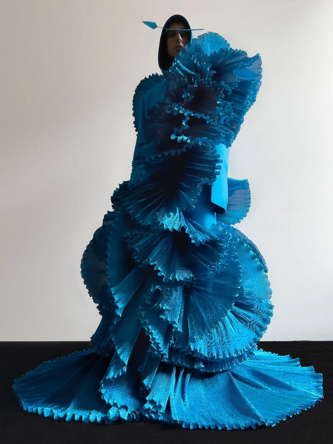 Gupta, inspired by the concepts of Eastern mysticism and in marrying maths abstractions to the ancient spiritual traditions of India, has come up with a wholly original vision of floating whorls and levitating layers. Picture a glittering goddess gown which is a celebration of dark and light, of yin and yang, or a pleated hooded cape that looks like an iridescent cloud.