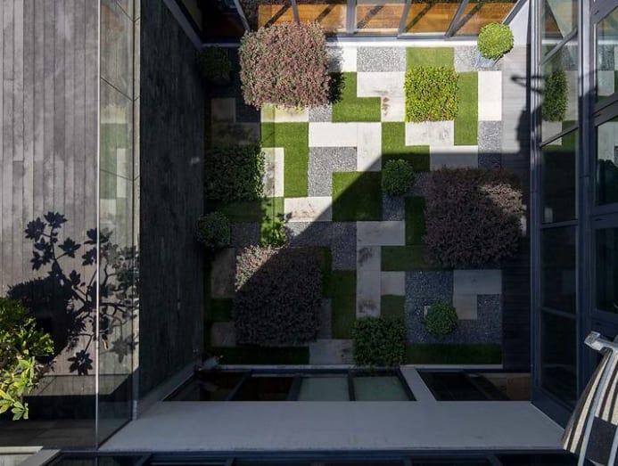 In between the two blocks is a landscaped courtyard in the basement. The owner initially wanted to construct a large treehouse here for his daughters but the fengshui master said it was inauspicious so he changed it into a Zen garden with a chessboard aesthetic. It brings plenty of daylight into the facing guest room and entertainment room, as well as provides pleasant views to admire from above.