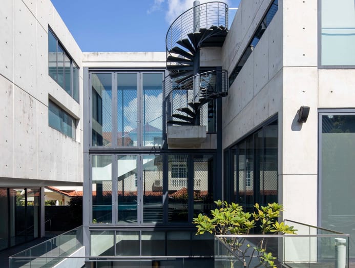 “The external steel spiral staircases are used to mediate levels and more importantly, to add interest as an external architectural element. Monochrome and greyscale marble and timber for the floors and cabinetry are used extensively in the interior,” said Lee on the minimal palette.