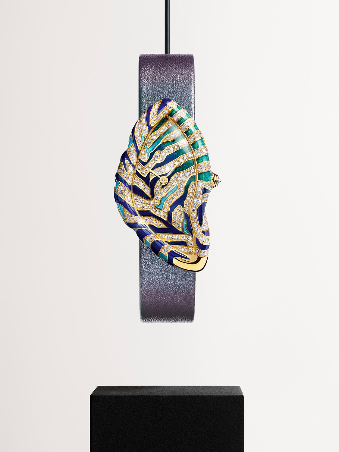 Still, it is a magnificent display of Cartier’s favourite things – wildlife references and weirdly shaped cases – dressed up in luscious enamel that melts into different shades of blue and green, and anchored with the resplendence of yellow gold and diamonds. A limited edition of 50 pieces.