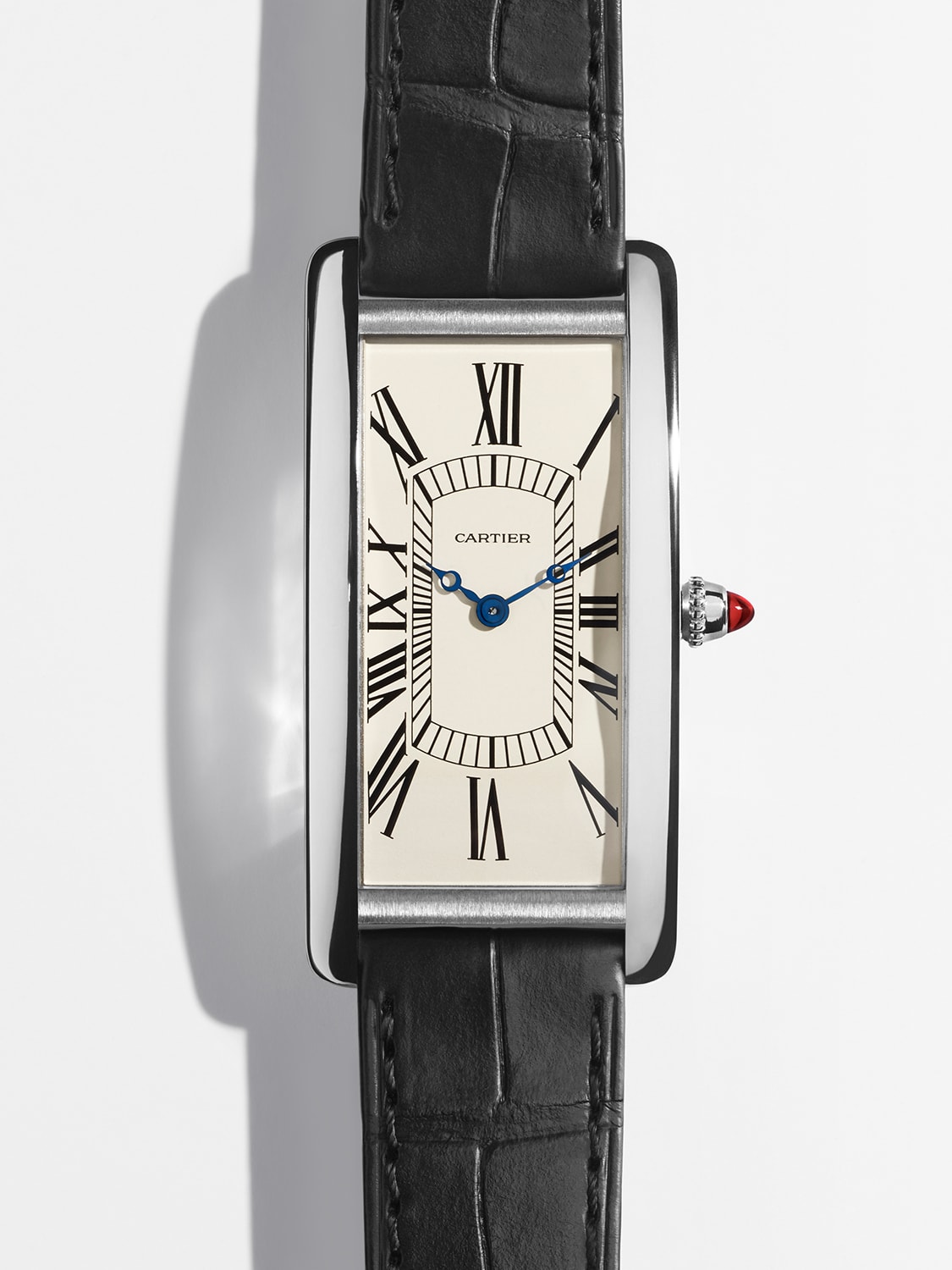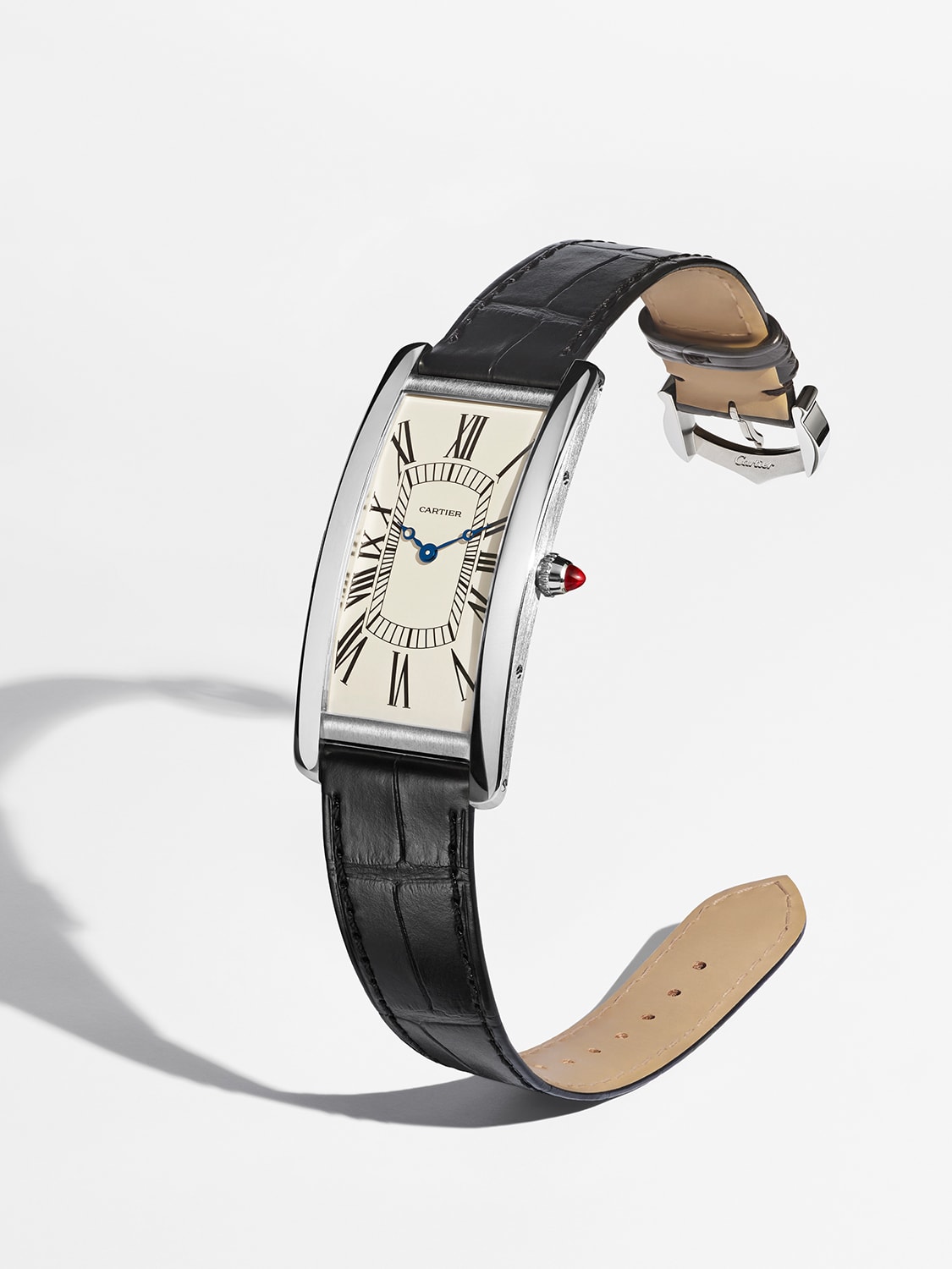 A ruby is set in the cabochon crown. Most Cartier Tanks have a cabochon – a gem protruding from the winding crown – albeit mostly made out of sapphire, which makes this ruby cabochon extra special.