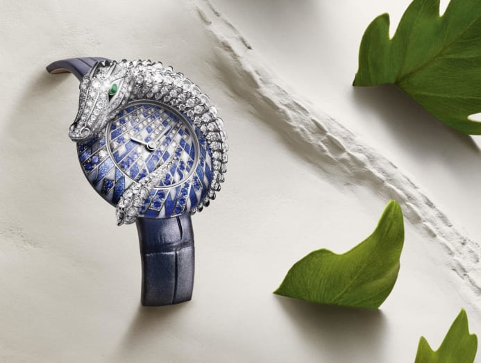 Elsewhere in jewellery watches, the maison has created five versions of the Reflection de Cartier, a structural, open bracelet watch defined by its bold geometry. They come in several variations from yellow gold to rose gold, a full diamond set with white gold and two white gold sets with diamonds and coloured stones.